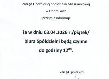 Administracja zawiadamia iż w budynku przy ulicy: M.KOPERNIKA 14 w dniu 23.03.2026r /poniedziałek/ w godz. od 17:00 do 20:00 przeprowadzony zostanie przegląd instalacji […]