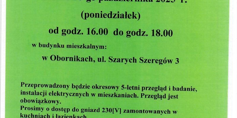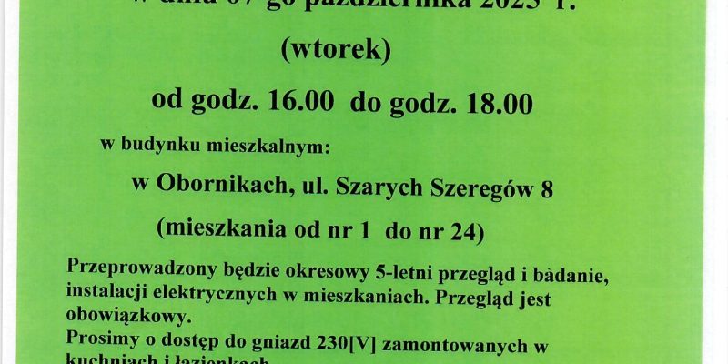 Administracja zawiadamia iż w budynku przy ulicy: SZPITALNA 3 w dniu 13.10.2025r /poniedziałek/ w godz. od 17:00 do 20:00 przeprowadzony zostanie przegląd […]