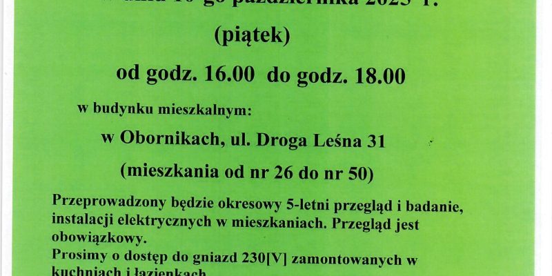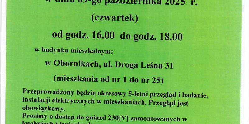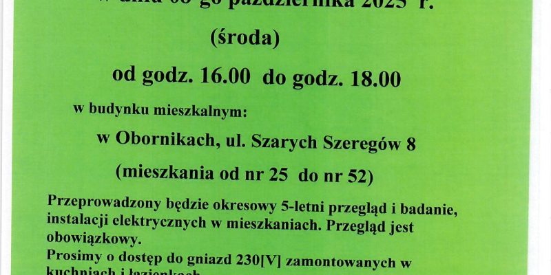 Administracja zawiadamia iż w budynku przy ulicy: Mikołaja Kopernika 16 w dniu 07.10.2025r /wtorek/ w godz. od 17:00 do 20:00 przeprowadzony zostanie […]